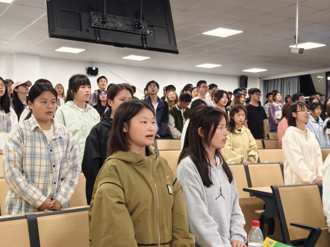 仪式在奏唱国歌中拉开了帷幕,大家庄严肃穆,歌声激昂,会场充满了满满的爱国之情。随后团支部书记龚迎春说明了举行本次入团仪式的意义,并宣布了新团员名单。团支部支委向新团员颁发了团章、团员证,佩戴上了团徽。